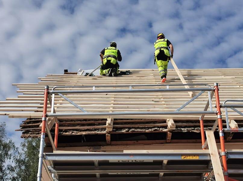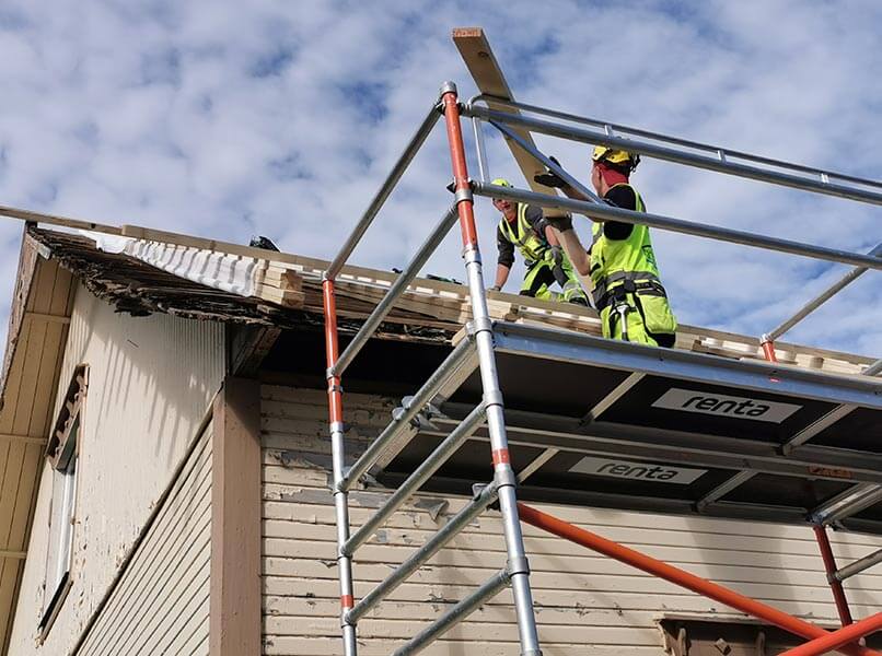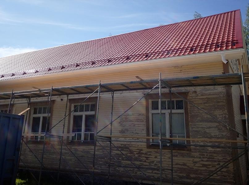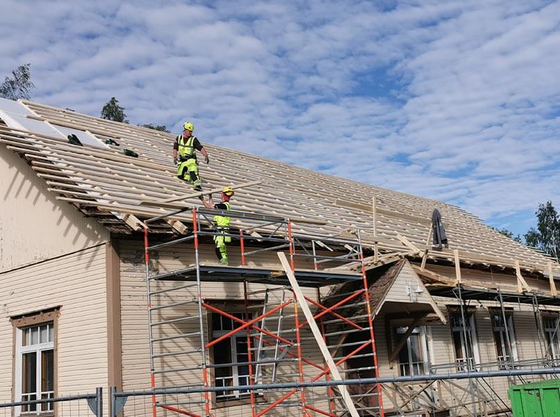 Rakennus oli hieman ajan myötä notkahtanut yhdeltä kulmalta, joten räsystälinjaa jouduttiin muokkaamaan melkolailla, että vesikatto saatiin asennettua.